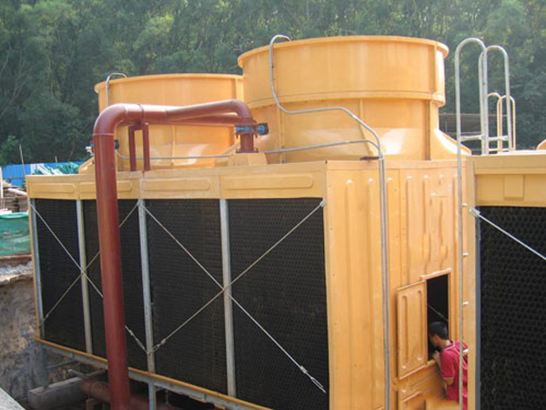方形横流式玻璃钢冷却塔采用两侧进风,靠顶部的风机,使空气经由塔两侧的填料,与热水进行介质交换,湿热空气再排向塔外。填料采用两面有凸点的点波片,通过安装头使点波片粘结成整体,以提高刚性,两面的凸点还可避免直接滴水,因此提高了水膜形成能力,填料尾部设有收水措施。